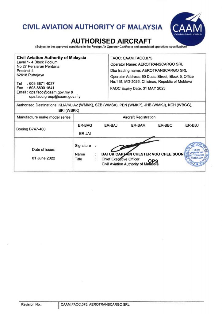 AUTHORIZED AIRCRAFT & DESTINATION